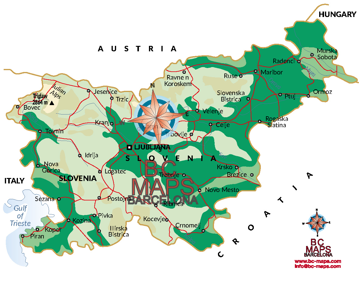Podemos crear cualquier tipo de mapa de Eslovenia, mapas de ciudades, mapas de regiones, mapas de municipios (občine) …etc. Un ejemplo de lo que podemos hacer sería este mapa :