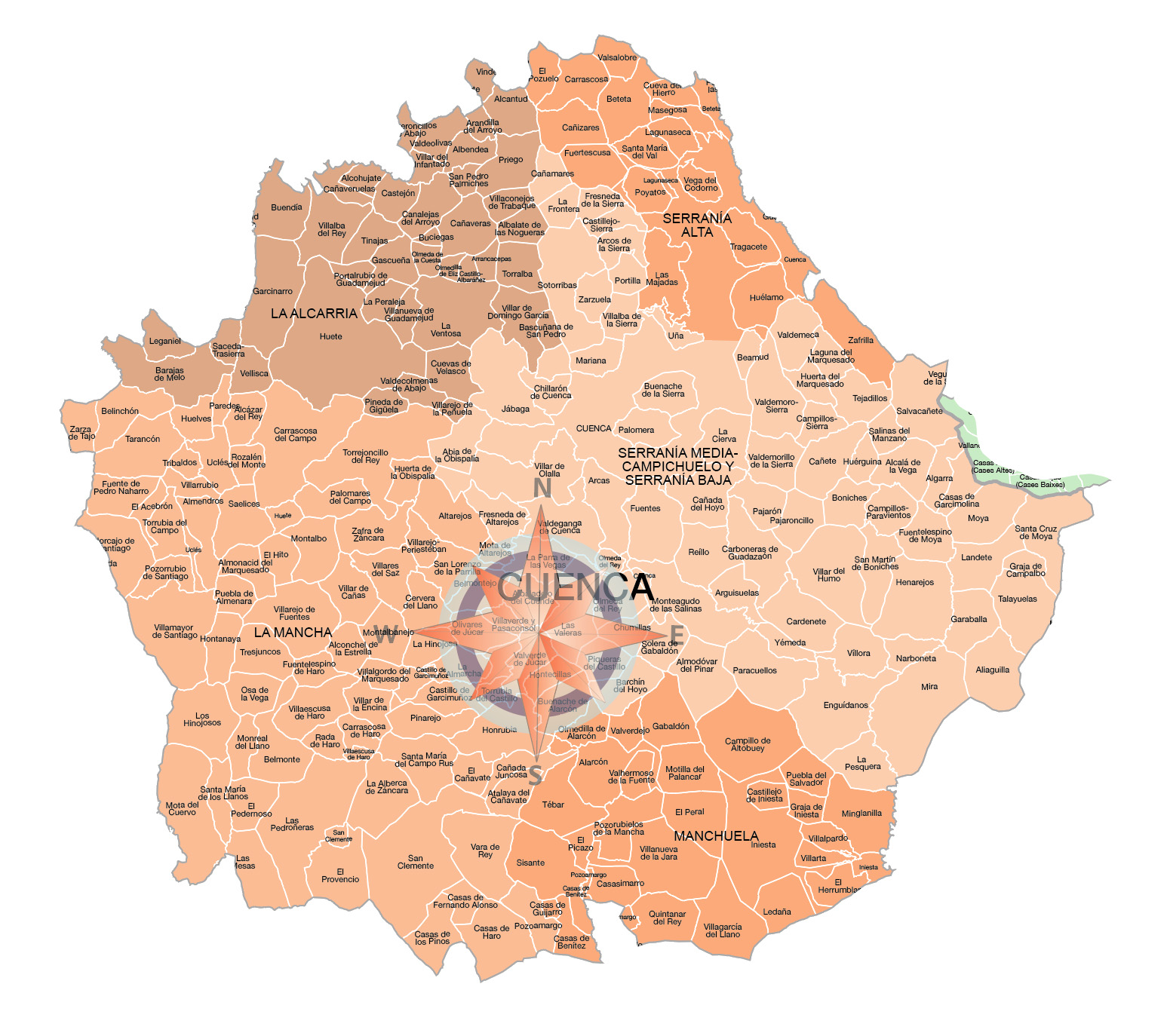 Disponemos de un mapa vectorial de Cuenca con la división completa y los nombres de los municipios y comarcas, diseñado para ofrecer la máxima calidad y precisión.