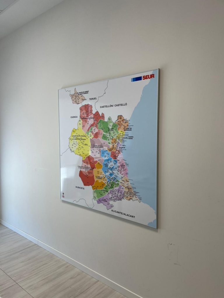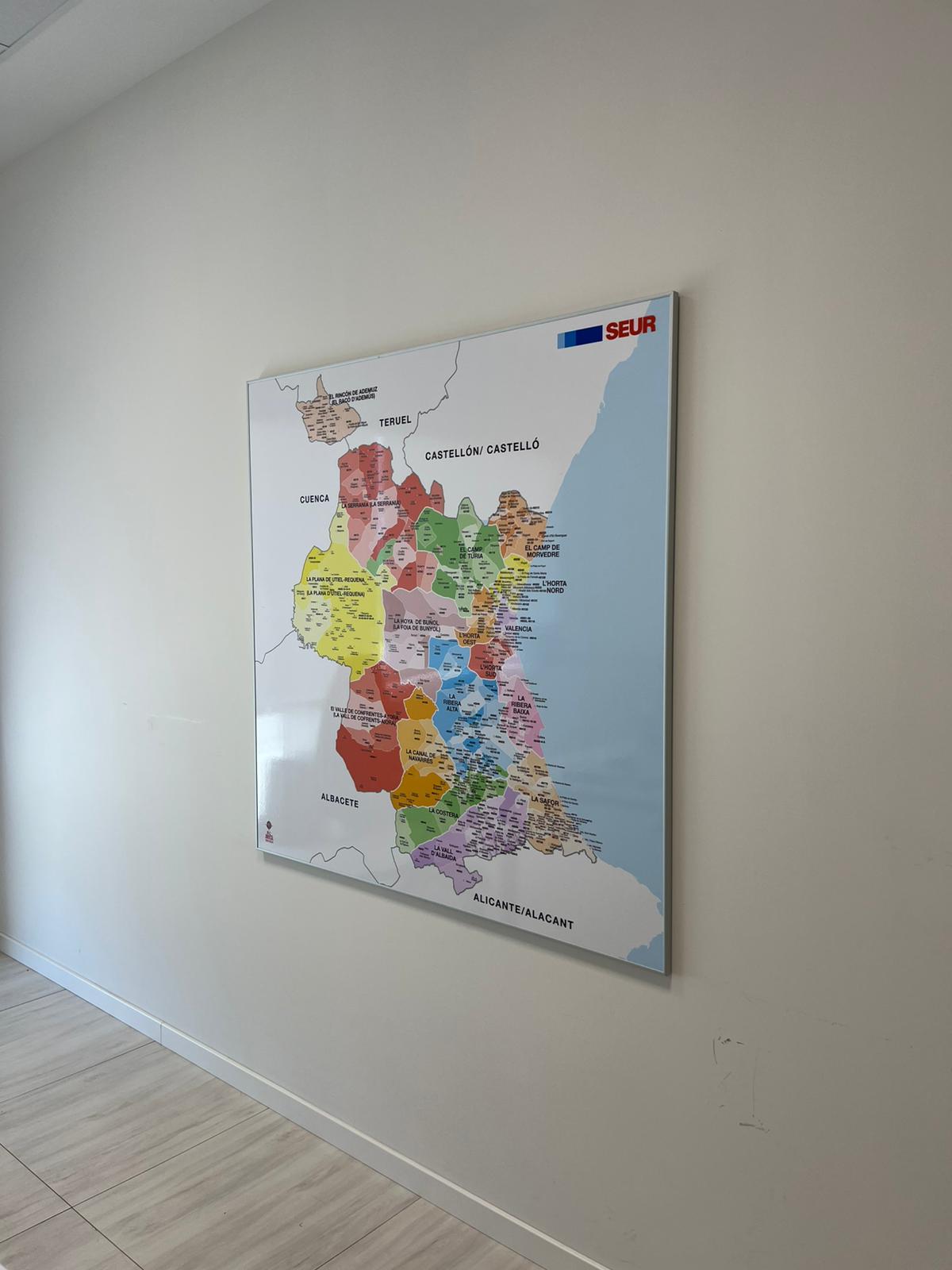 Entregamos a la empresa de mensajería SEUR unos murales personalizados, el primero de ellos de la ciudad de Valencia con los códigos postales y el segundo de la provincia que las comarcas con sus municipios y sus respectivos códigos postales.