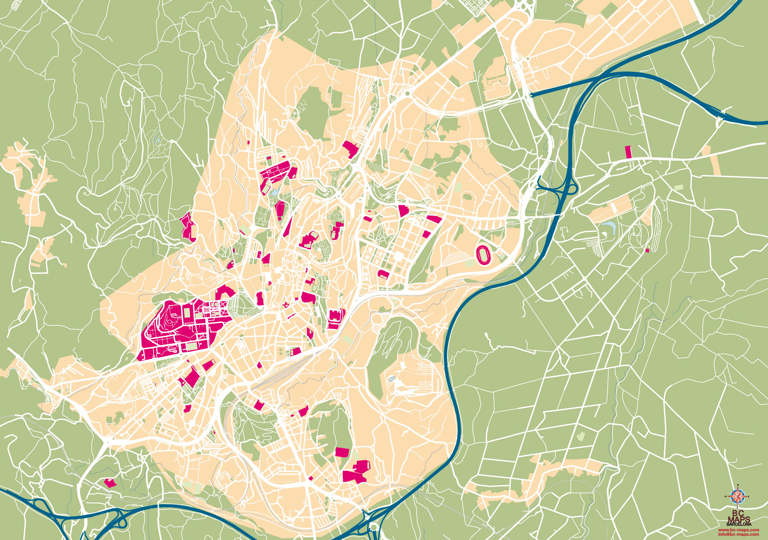 Podemos crear cualquier tipo de mapa de la ciudad de Santiago de Compostela, planos parciales, planos generales, planos de detalle, en formato illustrator.