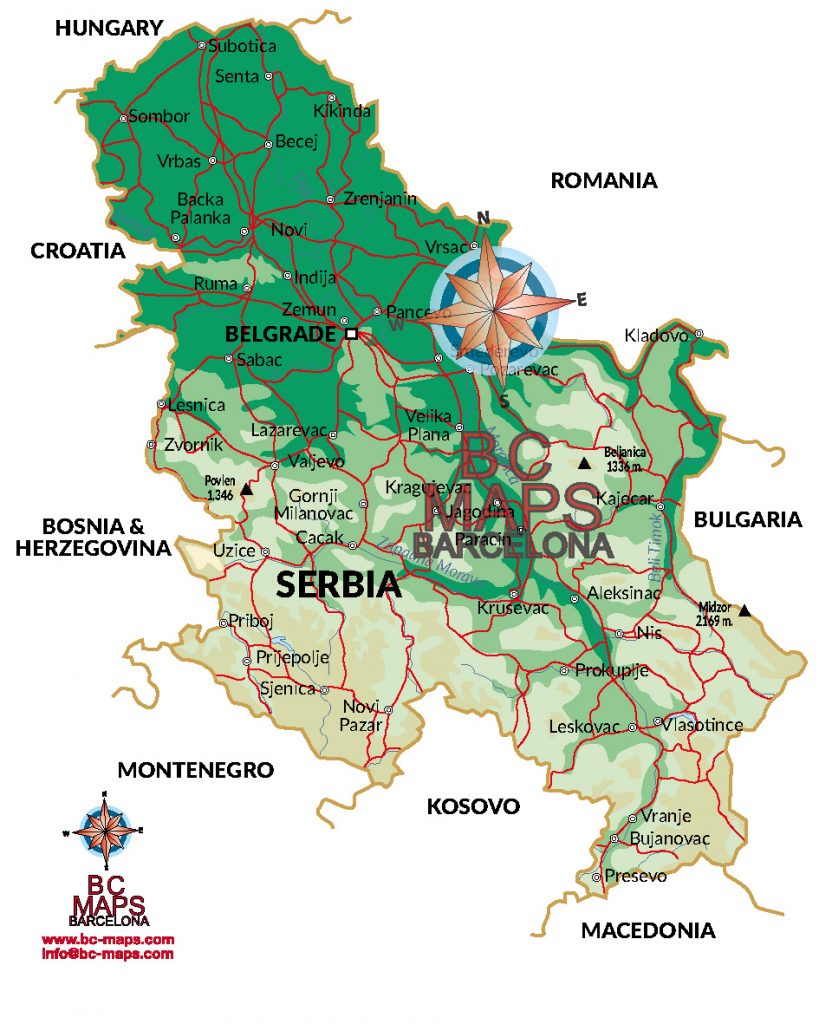 Un mapa vectorial en illustrator eps de Serbia , 100% editable, tanto texto como colores, le permitirá incorporarlo a sus publicaciones. Este archivo digital que representa gráficamente la geografía, la infraestructura y otros elementos geoespaciales  en forma de vectores.